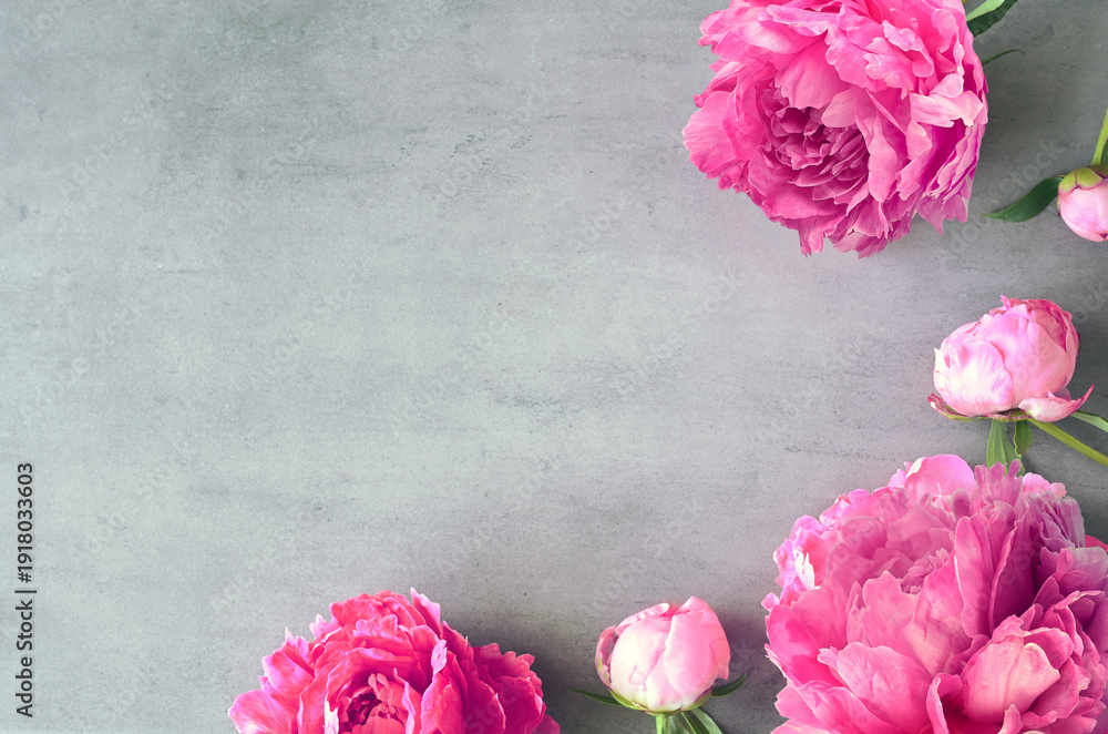 Summertime floral concept with bright purple peonies on concrete background with copy space