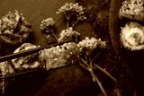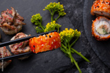 sushi roll in chopsticks and shiitake mushrooms beautiful served at black dish. top view. macro shot