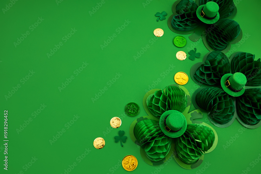 St. Patrick's day celebration with shamrocks, leprechaun hats, gold coins
