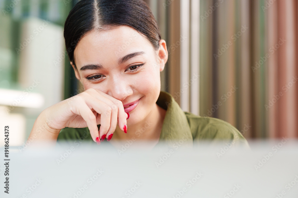 Young, beautiful Asian woman in green shirt smiling with joy, looking at computer laptop screen in outdoor cafe. Online entertainment, social media in modern lifestyle.