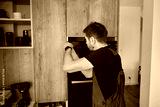 Man using screwdriver to fixing new built in microwave oven with screws in modern kitchen cabinet. Concept of home appliances installing