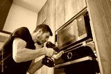 Man in workwear installing built in microwave above oven using cordless screwdriver in wooden kitchen cabinet