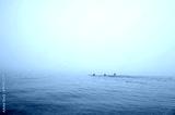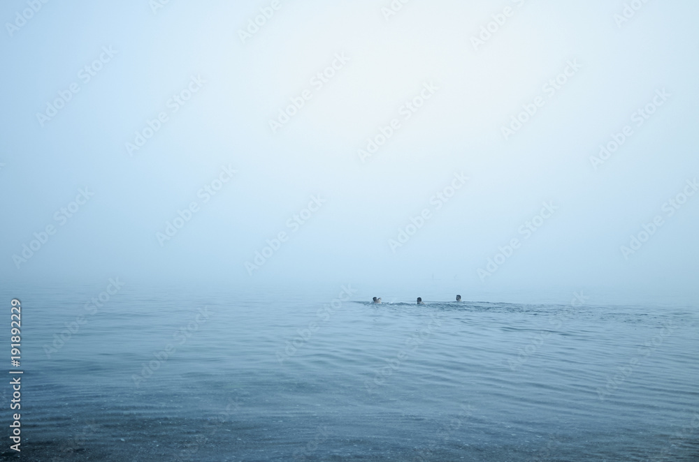 men swimming in the sea with Fog in Barceloneta beach Barcelona
