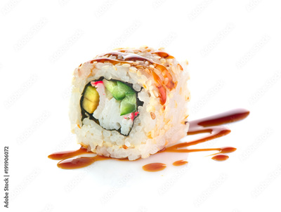 Sushi roll isolated on white background. California sushi roll with tuna, vegetables and unagi sauce closeup