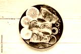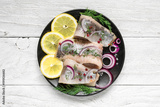 Herring fillet with salt, pepper, herbs, onion and lemon on black plate on white background