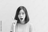 Young girl happy in red dress and is Point the finger. Concept summer travel.