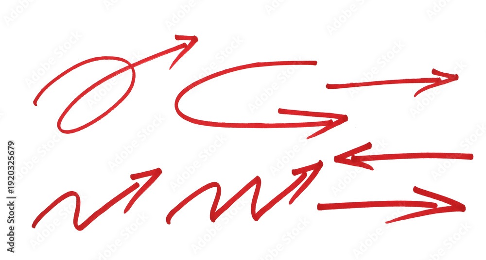 Hand Drawn Red Marker Arrow Set with Clean Sketch Lines and Curvy Directional Pointers