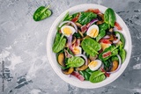 lunch bowl of spinach salad with bacon, mushrooms, eggs and red onions