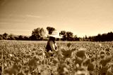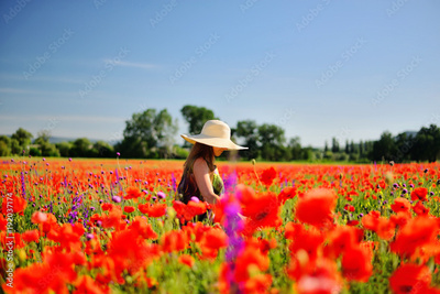 Cute girl in a straw hat in a blooming field of red poppies at sunset