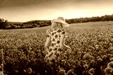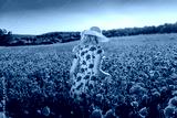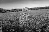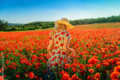Cute girl in a straw hat in a blooming field of red poppies at sunset, positive emotions