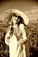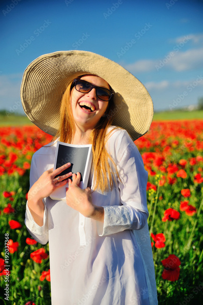 Young cute woman with a book in her hand in a hat in a flourishing poppy field experiences positive emotions