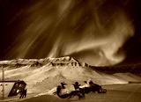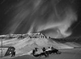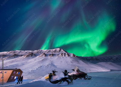 The polar arctic Northern lights aurora borealis sky star in Norway Svalbard in Longyearbyen city snowscoter mountains