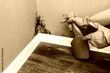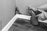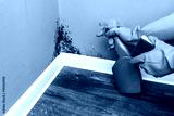 Spray bottle and sponge near black mould wall. House cleaning concept