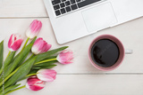 Women's day. Pink tulips, laptop and a cup of coffee on an white desk, top view