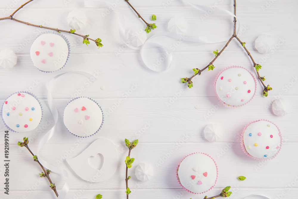 Top view Easter holiday composition of branches with young shoots of greenery, decorated cupcakes, merengue sweets, ribbon and colored bird figure on wooden background. Art concept. Selective focus.