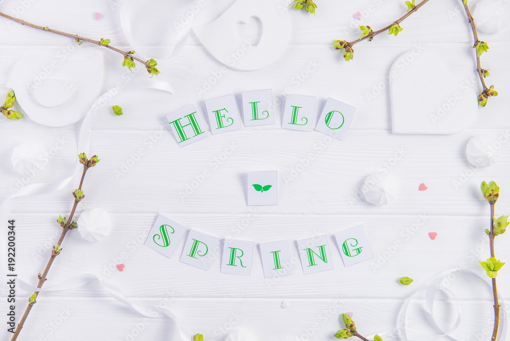 Top view composition of Hello spring lettering, branches with young shoots of greenery, merengue sweets and candy hearts, handcraft bird figure on wooden background. Art concept. Selective focus.