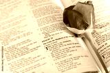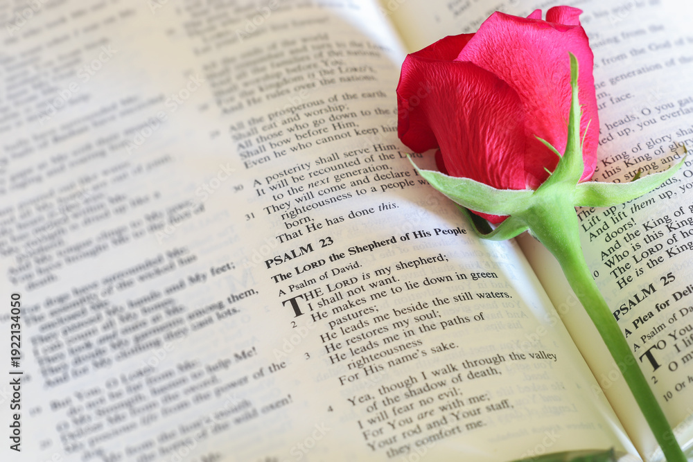 Bible open to Palams 23 with a red rose on the page