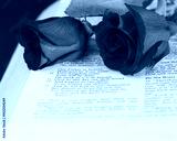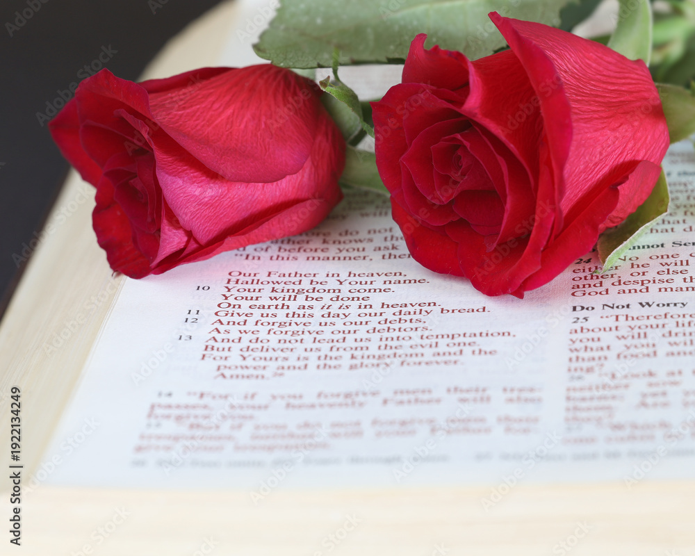 Bible open to the lord's prayer with a red rose on the page