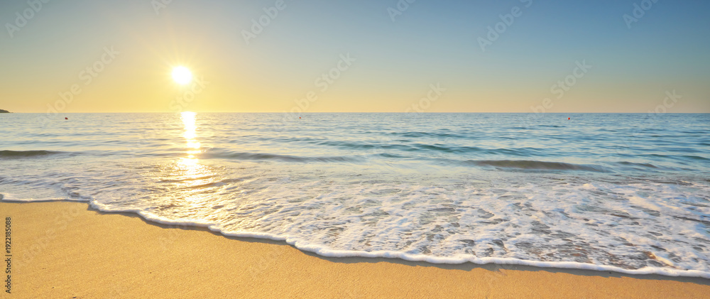 Sea sand beach shore during sunset.