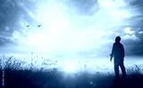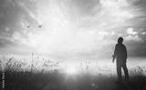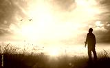 Human Rights Day concept: Silhouette of human standing to worship God in meadow autumn sunset background