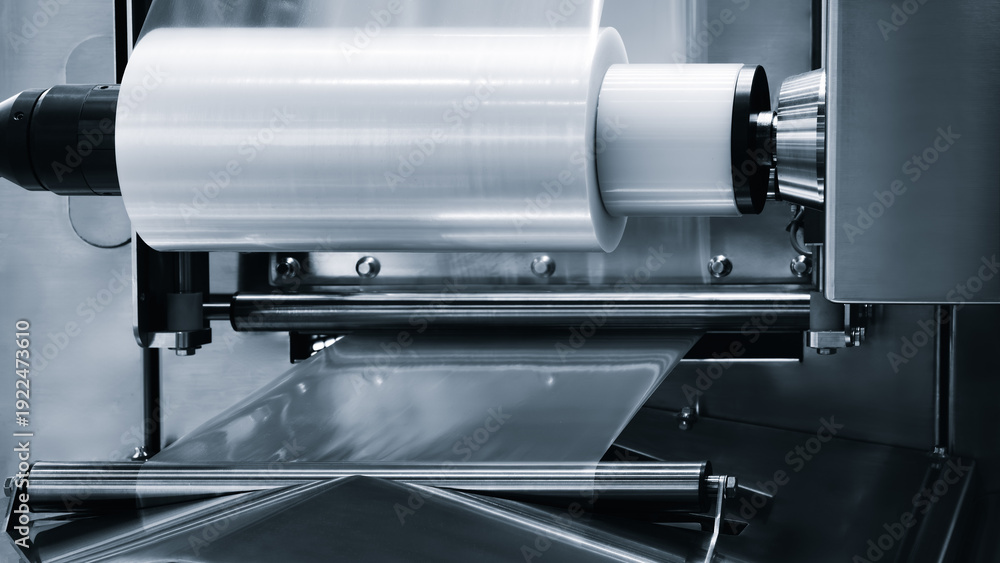 Automatic polyethylene plastic bag production machine with lighting effect. Close-up of the roller of the plastic bag production machine in the light blue scene. product packaging concept