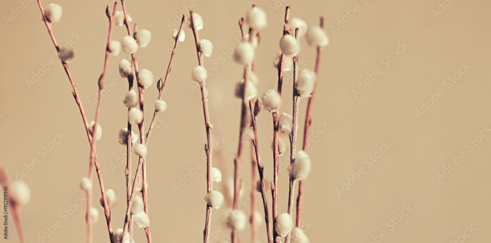 Close-up of delicate willow branches with soft, fluffy catkins against a beige background, showcasing the natural beauty of springtime flora. banner