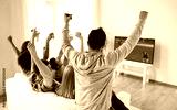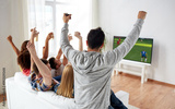 friends watching soccer on tv and celebrating goal