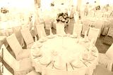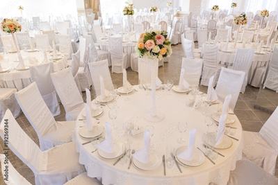 flower decor, furniture, restaurant concept. there are tables and chairs, all are covered with white clothes and served for guests with shining plates and glasses, on each there is bouquet of flowers