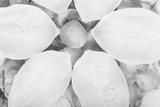 nature, calm, harmony concept. there is close up of adorable snowy white petals of tulip flowers that like little boats are floating on the surface of clean water in basin