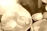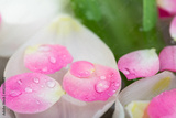 nature elements, calmness, harmony concept. there are amount of blooming buds of white tulips covered bu clean transparent water on the surface of which petals of roses are floating