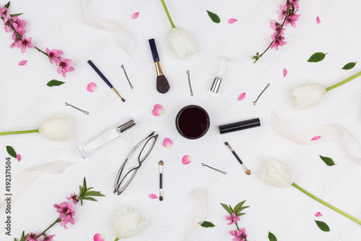cosmetology, womanhood, beauty concept. on the snowy white surface there are a frame created of collected flowers and there is mess made of different stuff for make up