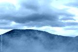 weather, mood, fall concept. typical autumn view in the mountains, under the high hill covered with trees there are heavy rain clouds and at th foot of the hill there is a fog