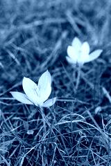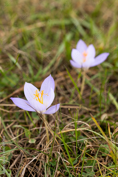 relish, nature, planting concept. close up of megnificent small flowers with leaves of almost white colour with lilac shades and bright orange stamens that usually used for seasoning
