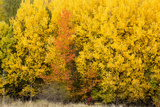 seasons, wild nature, ecology concept. almost all trees are covered bright yellow leaves but some of them turned red or even coral coloures with the coming of autumn