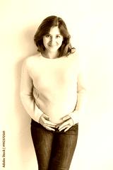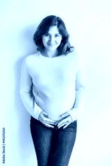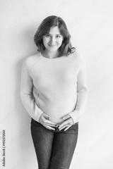 love, healthcare, expectation concept. there is a smiling woman who is wearing stylish but simple clothes, she is pregnant and habby, she is delicately hugging her belly