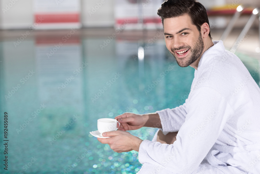handsome young man in bathrobe holding cup of coffee and smiling at camera in spa center