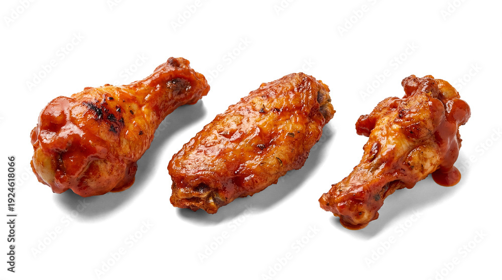 delicious barbecue chicken wings and drumsticks, a popular appetizer and snack, photographed in a studio setting with a plain transparent background.