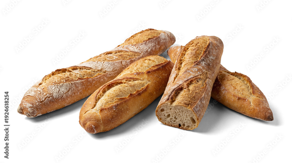 a group of classic french baguettes, featuring their signature textured crust and golden hue, isolated on a transparent background for versatile design use.