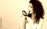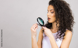 Beautiful girl with long curly hair and magnifier looking close up on her hair top analysing damage and dry hair concept