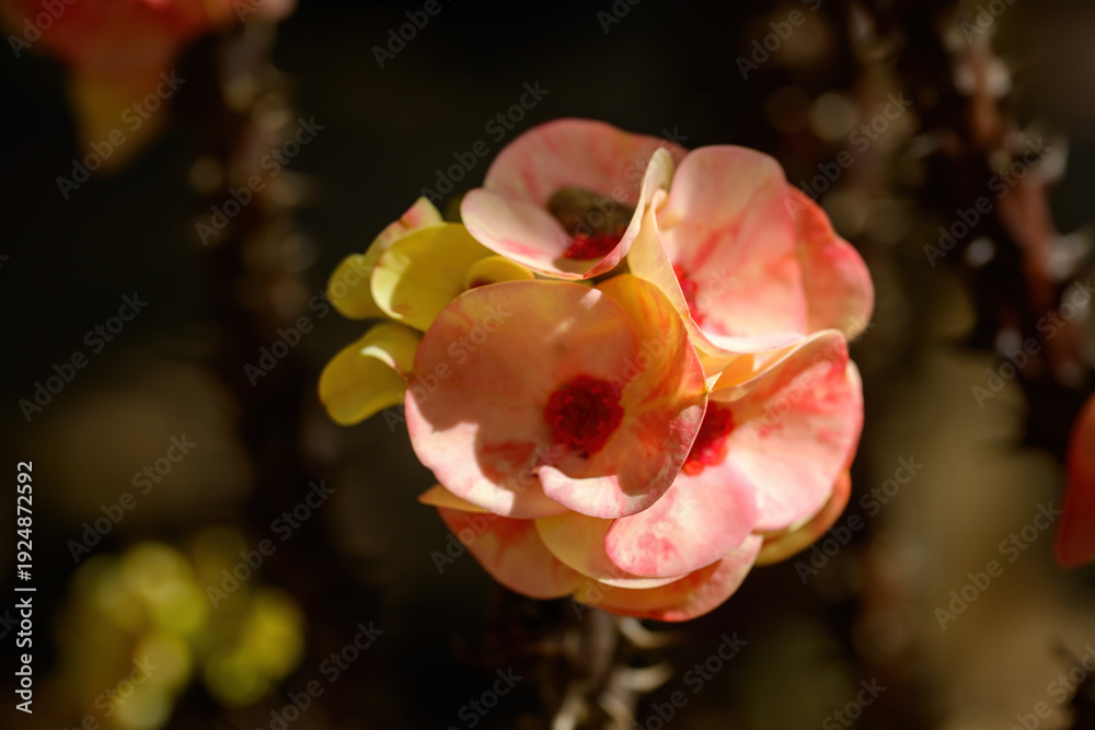 Euphorbia milli flower or Crown of thorns plant Bright flowers with beautiful, thorny stems.