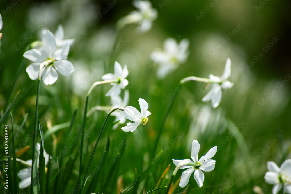 White daffodil narcissus flowers on Golica mountain, Slovenia, at spring. Easter background