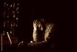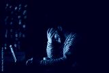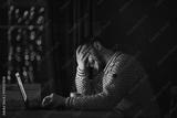 close-up portrait of an attractive man with a beard sitting behind a laptop smiling working in a social network