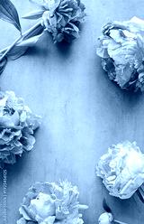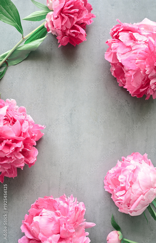 Summertime floral concept with bright purple peonies on cocnrete background with copy space