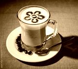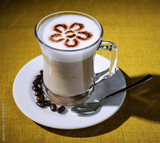 Delicious latte art flavored coffee in clear glass cup on white saucer with coffee beans