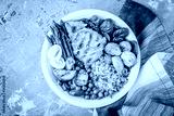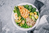 Healthy grilled vegetables buddha bowl with chicken and quinoa, spinach, egg, zucchini, asparagus, Brussels sprouts and green peas