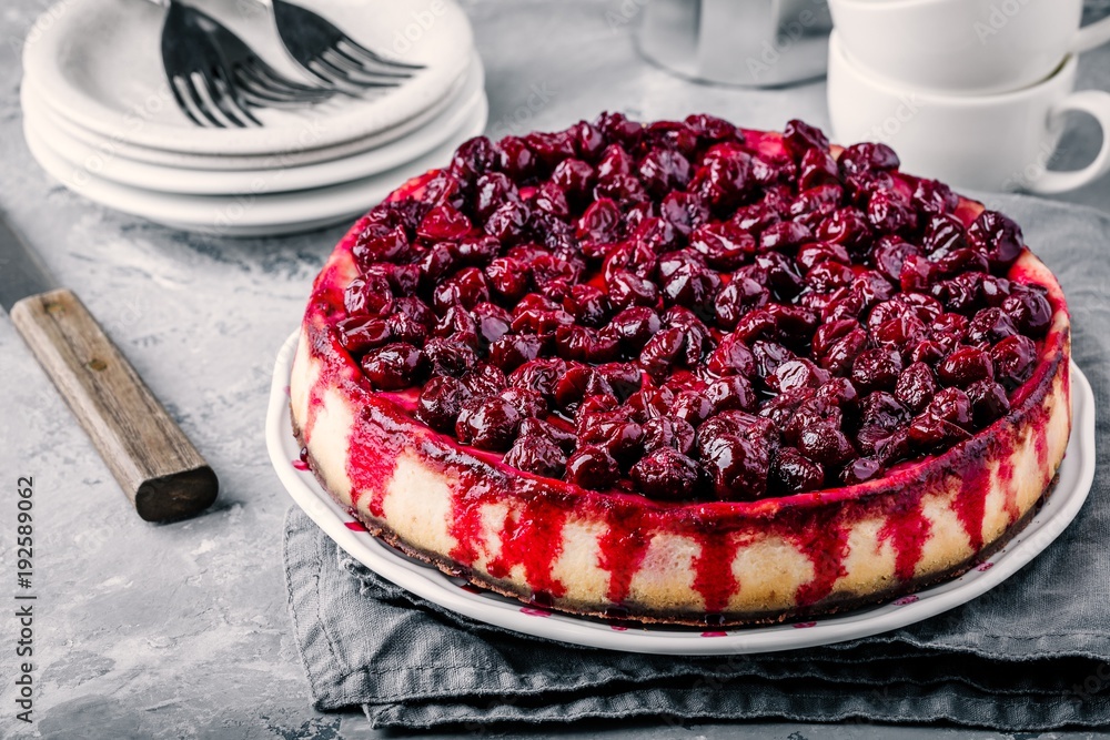 homemade cheesecake with chocolate base and cherry sauce