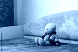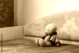 Lonely teddy bear sitting alone on bed in children room interior symbol of childhood loneliness, isolation and emotional neglect concept