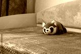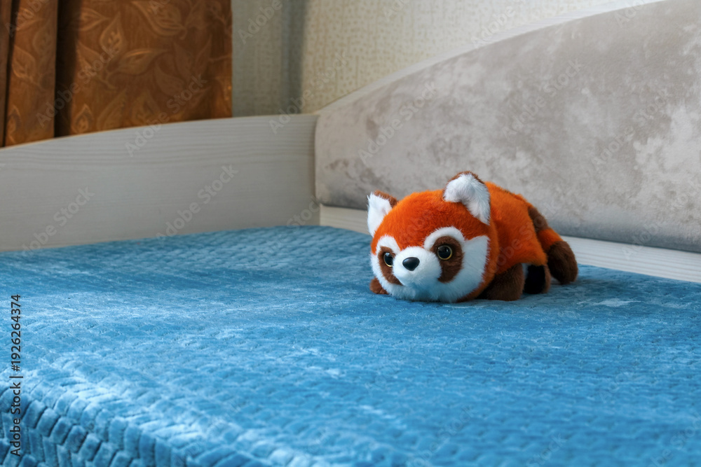 Plush red panda toy on bed in children room interior with soft headboard and blue blanket, cozy nursery atmosphere and home comfort