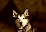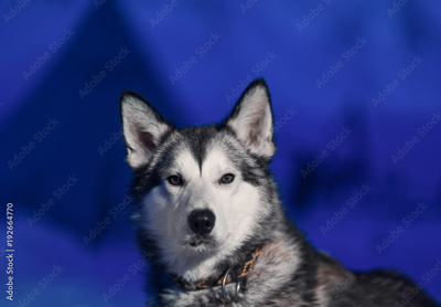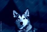 husky dog sitting close-up of white light eyes against the background of a polar winter night on Spitsbergen Svalbard Longyearbyen