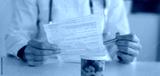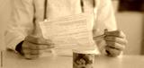 Pharmacist reading prescription, analyzing information about drug in pharmacy concept